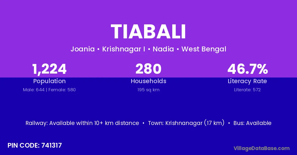 Krishnanagar (17 km) is the nearest town to Tiabali village for major economic activities and is located approximately 17 km away.