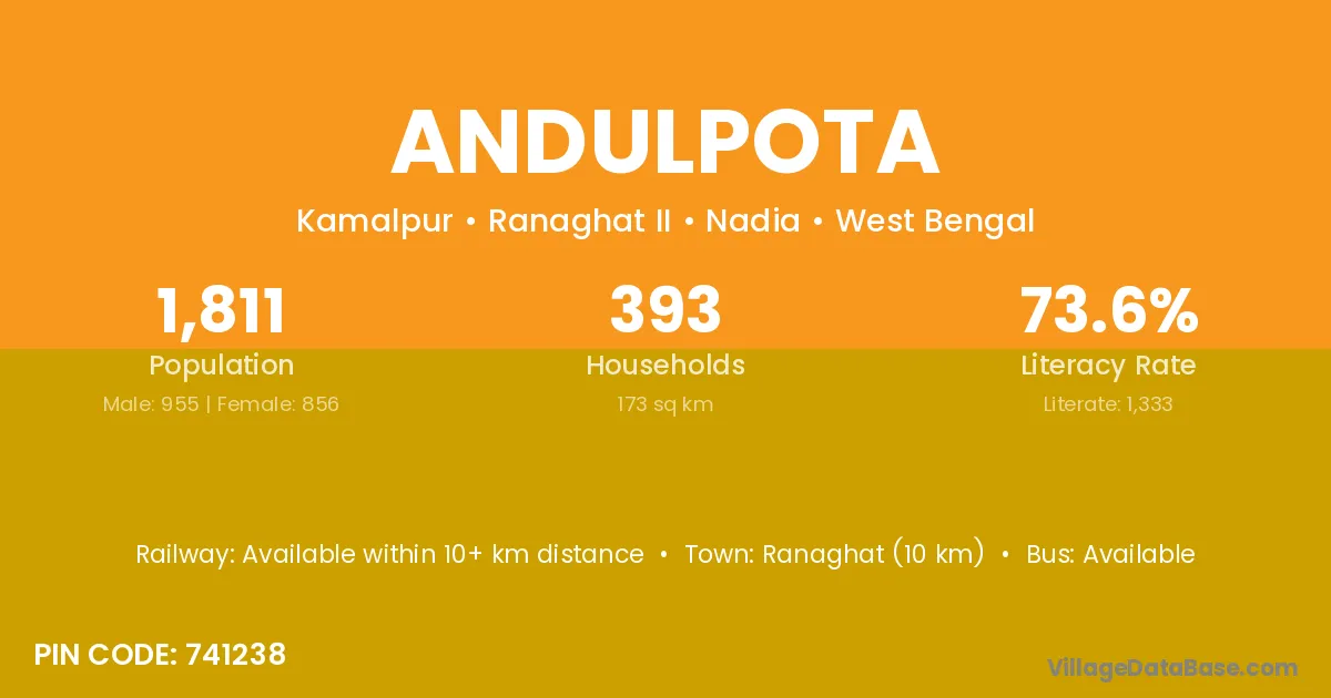 Andulpota village is located in the Krishnagar I Subdivision of the Nadia district in West Bengal.