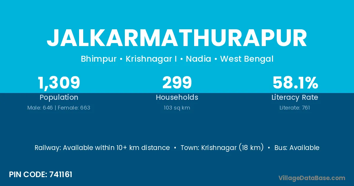 Krishnagar (18 km) is the nearest town to Jalkarmathurapur village for major economic activities and is located approximately 18 km away.