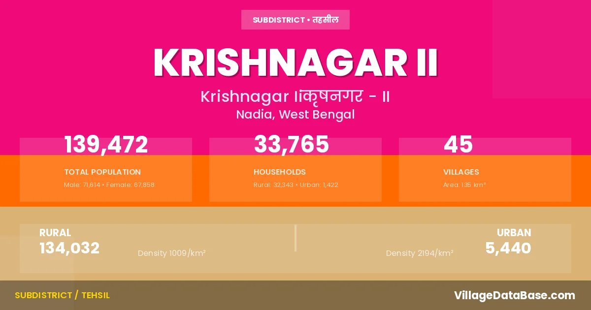 According to the 2011 census The total area of Krishnagar II Subdivision is 135 km², with a population of 139472 people. The population density is 1,031 inhabitants per square kilometre, and there are approximately 33765 houses in the sub district.