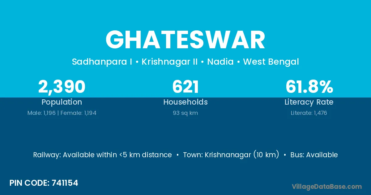 Krishnanagar (10 km) is the nearest town to Ghateswar village for major economic activities and is located approximately 10 km away.