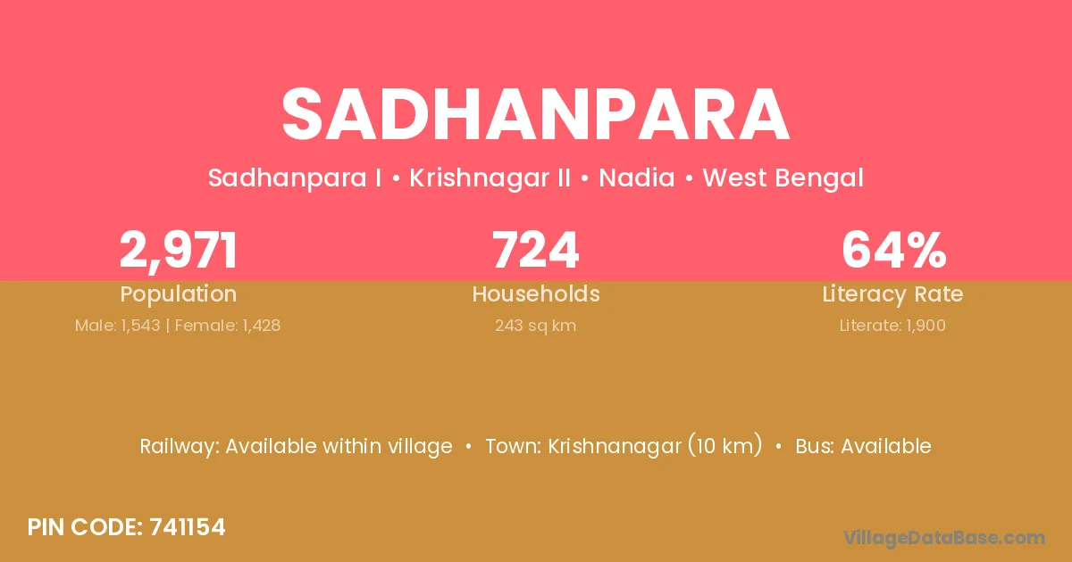 Krishnanagar (10 km) is the nearest town to Sadhanpara village for major economic activities and is located approximately 10 km away.