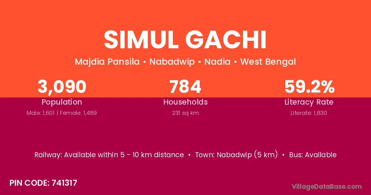 Nabadwip (5 km) is the nearest town to Simul Gachi village for major economic activities and is located approximately 5 km away.