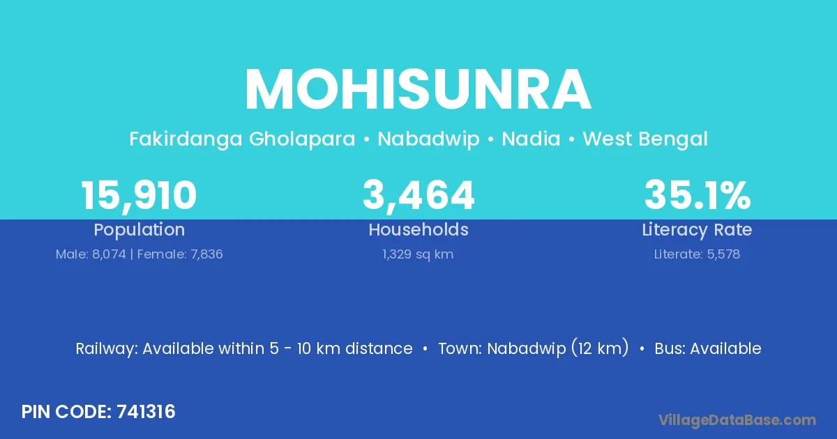 Nabadwip (12 km) is the nearest town to Mohisunra village for major economic activities and is located approximately 12 km away.