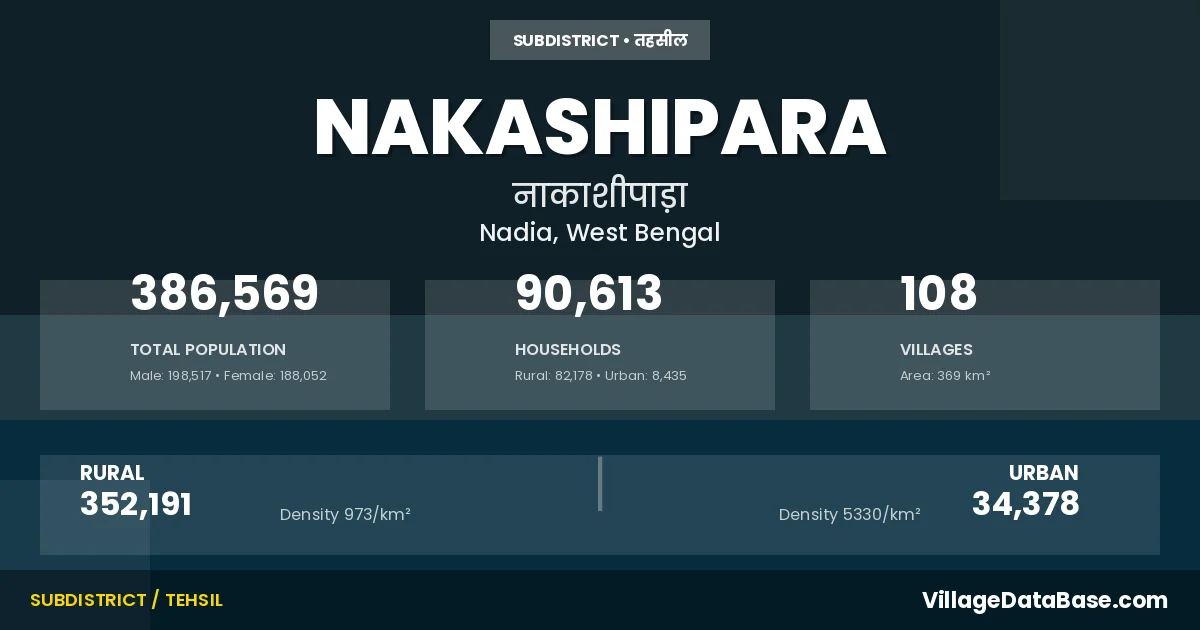 According to the 2011 census The total area of Nakashipara Subdivision is 369 km², with a population of 386569 people. The population density is 1,049 inhabitants per square kilometre, and there are approximately 90613 houses in the sub district.