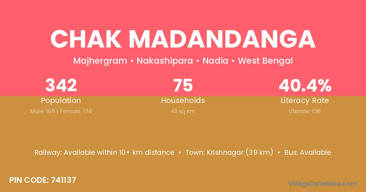 Krishnagar (39 km) is the nearest town to Chak Madandanga village for major economic activities and is located approximately 39 km away.