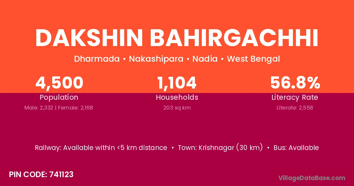 Krishnagar (30 km) is the nearest town to Dakshin Bahirgachhi village for major economic activities and is located approximately 30 km away.