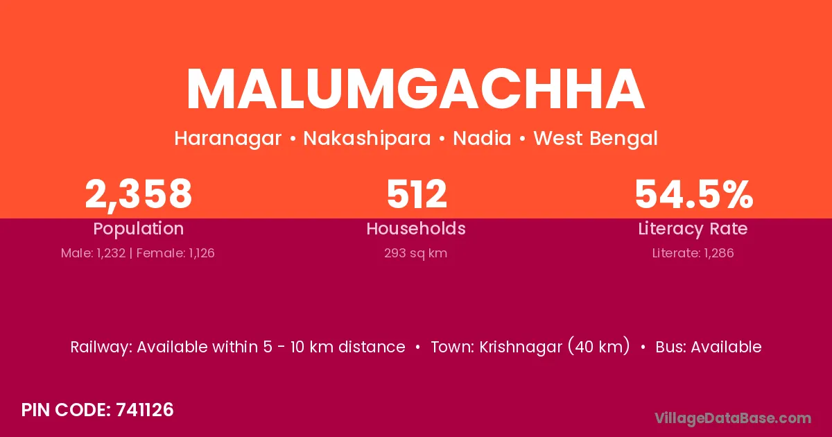 Krishnagar (40 km) is the nearest town to Malumgachha village for major economic activities and is located approximately 40 km away.