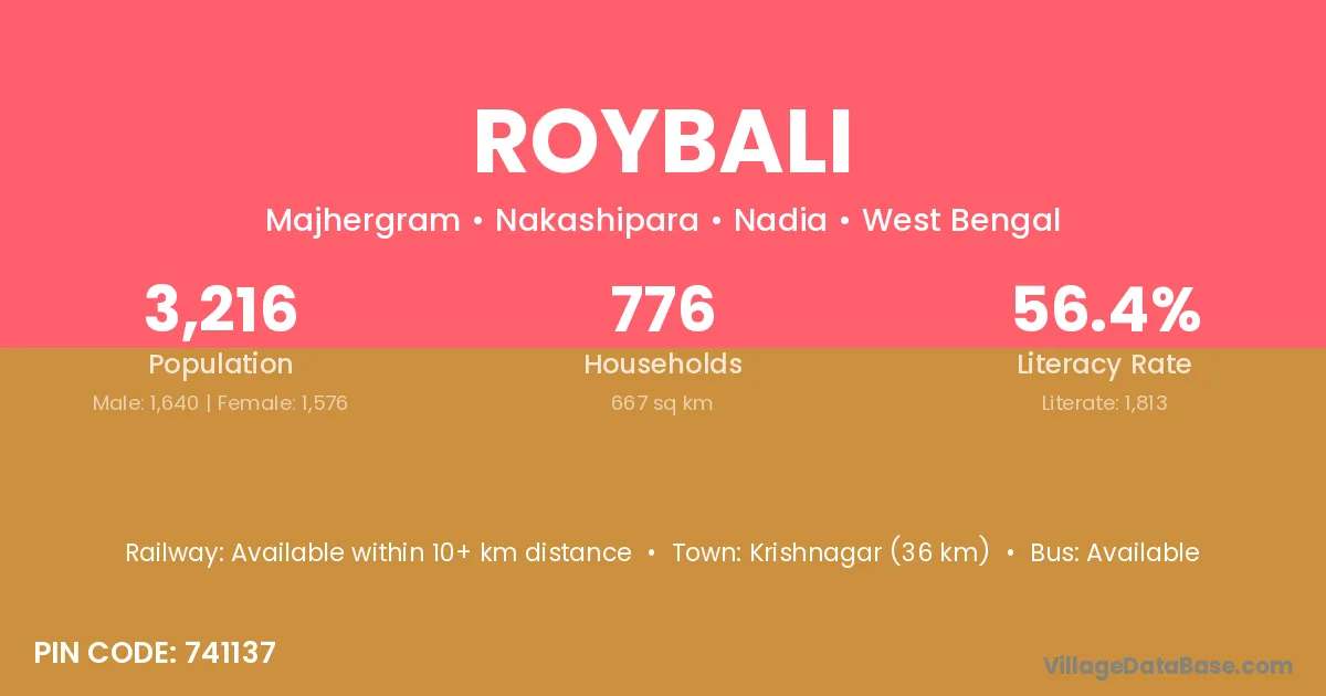 Krishnagar (36 km) is the nearest town to Roybali village for major economic activities and is located approximately 36 km away.