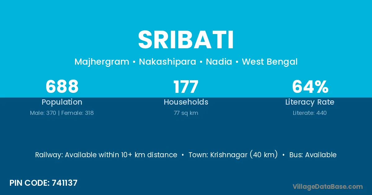 Krishnagar (40 km) is the nearest town to Sribati village for major economic activities and is located approximately 40 km away.