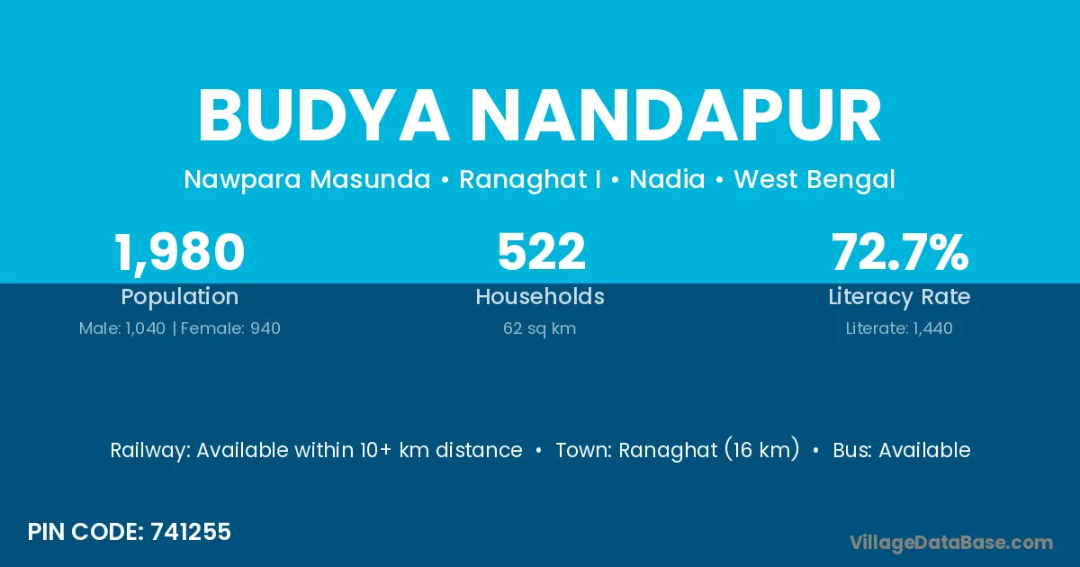 Ranaghat (16 km) is the nearest town to Budya Nandapur village for major economic activities and is located approximately 16 km away.