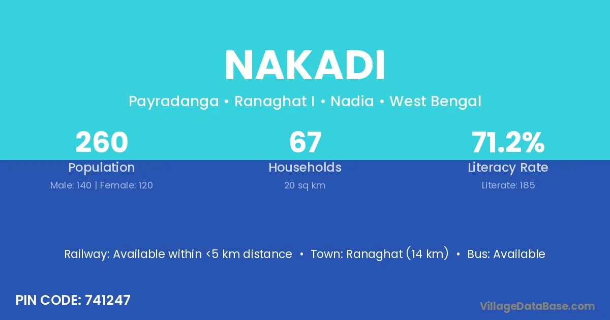 Ranaghat (14 km) is the nearest town to Nakadi village for major economic activities and is located approximately 14 km away.