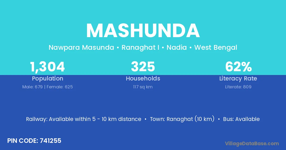 Mashunda village is located in the Ranaghat I Subdivision of the Nadia district in West Bengal.
