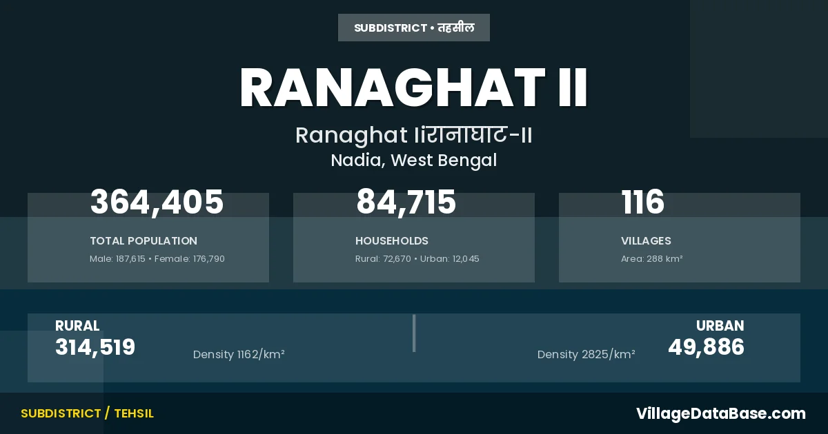 According to the 2011 census The total area of Ranaghat II Subdivision is 288 km², with a population of 364405 people. The population density is 1,264 inhabitants per square kilometre, and there are approximately 84715 houses in the sub district.