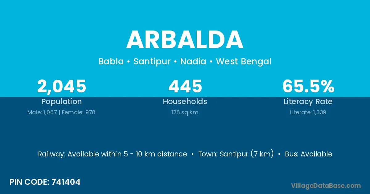 Santipur (7 km) is the nearest town to Arbalda village for major economic activities and is located approximately 7 km away.