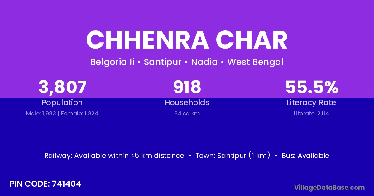 Santipur (1 km) is the nearest town to Chhenra Char village for major economic activities and is located approximately 1 km away.