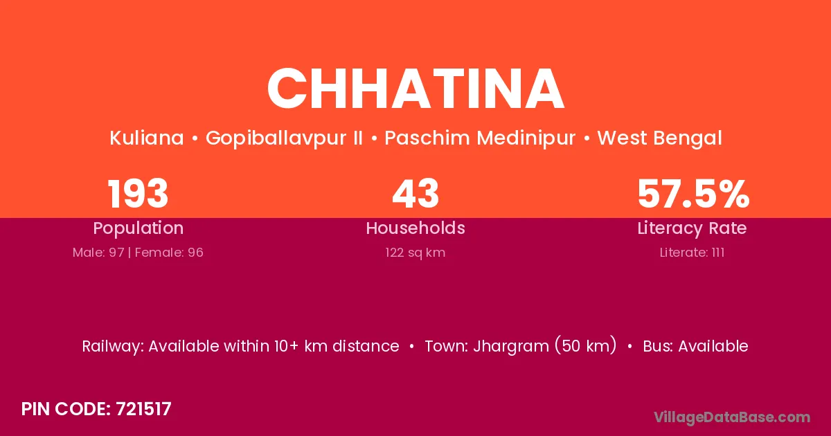 Krishna Nagar (10 km) is the nearest town to Chhatina village for major economic activities and is located approximately 10 km away.