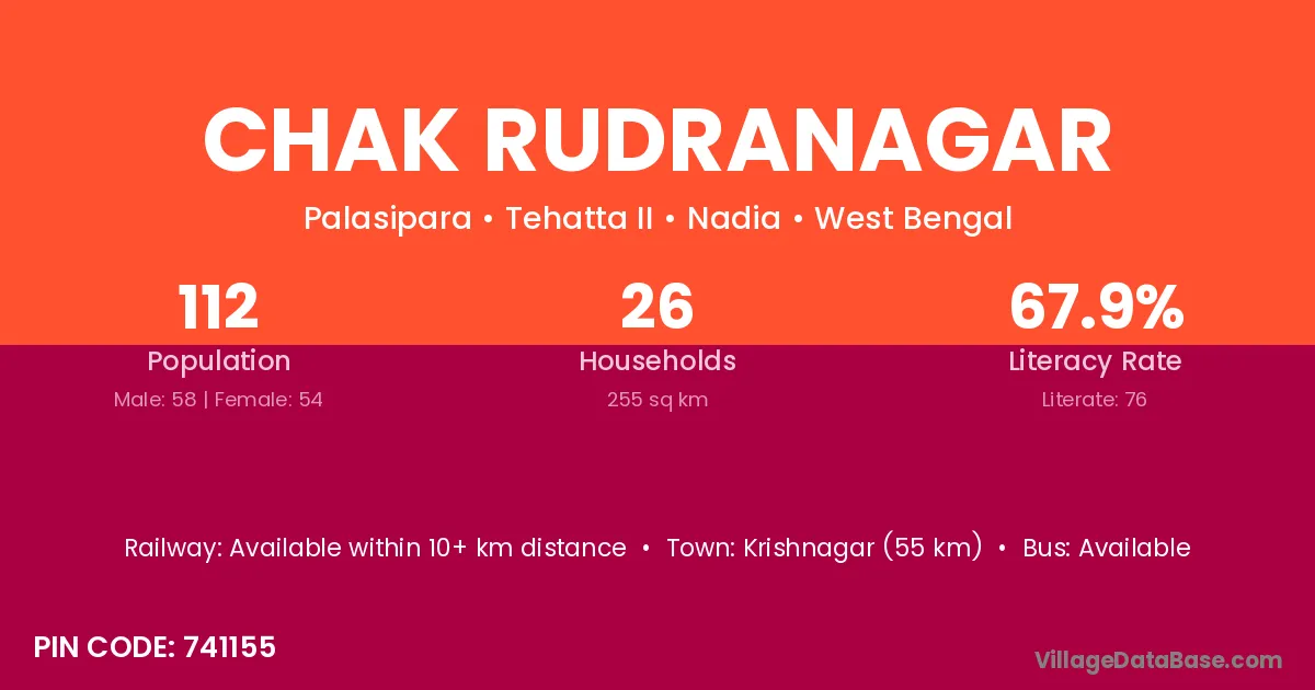 Krishnagar (55 km) is the nearest town to Chak Rudranagar village for major economic activities and is located approximately 55 km away.