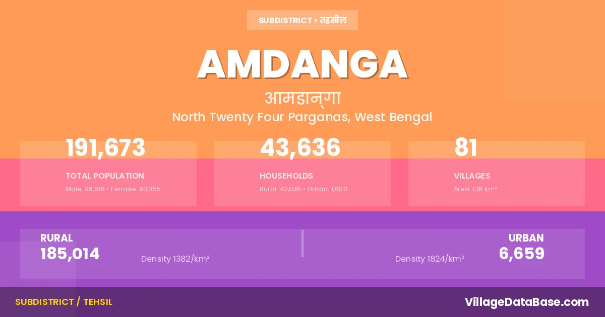 According to the 2011 census The total area of Amdanga Subdivision is 138 km², with a population of 191673 people. The population density is 1,393 inhabitants per square kilometre, and there are approximately 43636 houses in the sub district.