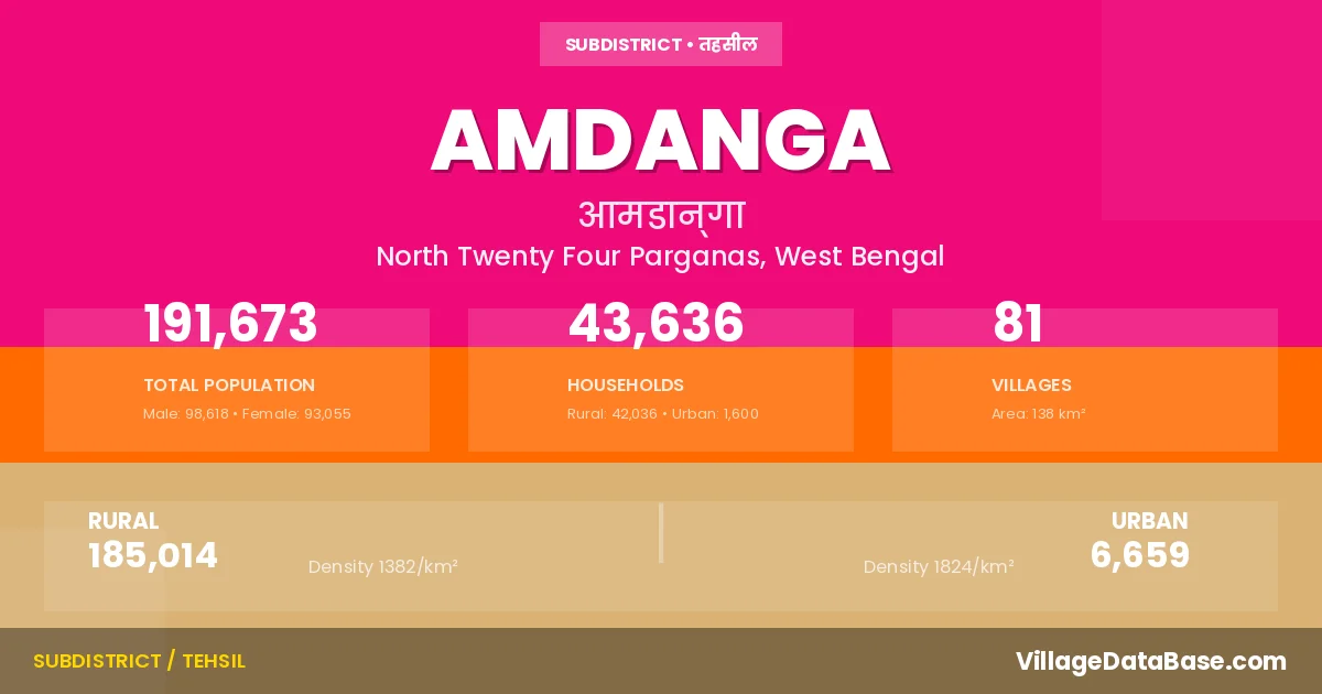 According to the 2011 census The total area of Amdanga Subdivision is 138 km², with a population of 191673 people. The population density is 1,393 inhabitants per square kilometre, and there are approximately 43636 houses in the sub district.