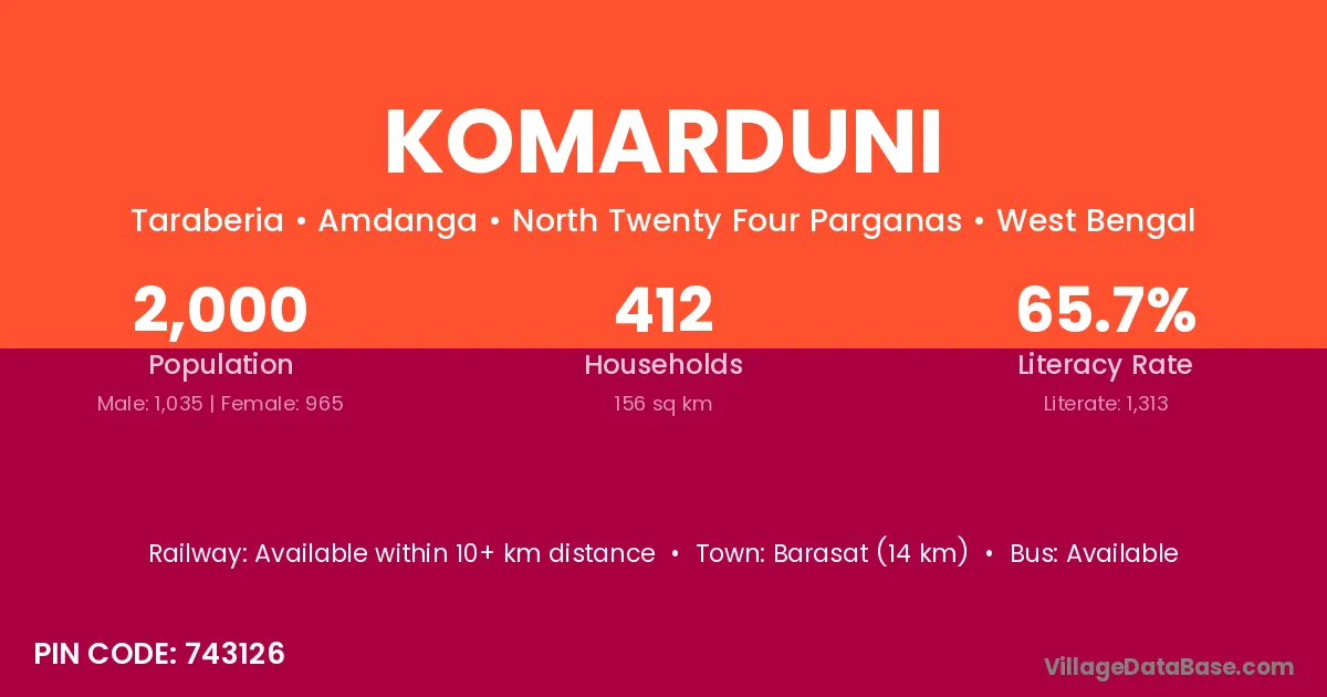 Barasat (14 km) is the nearest town to Komarduni village for major economic activities and is located approximately 14 km away.