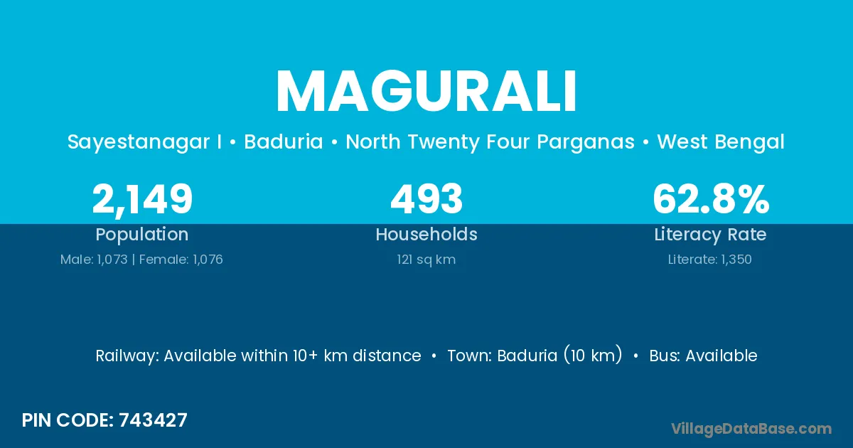 Baduria (10 km) is the nearest town to Magurali village for major economic activities and is located approximately 10 km away.