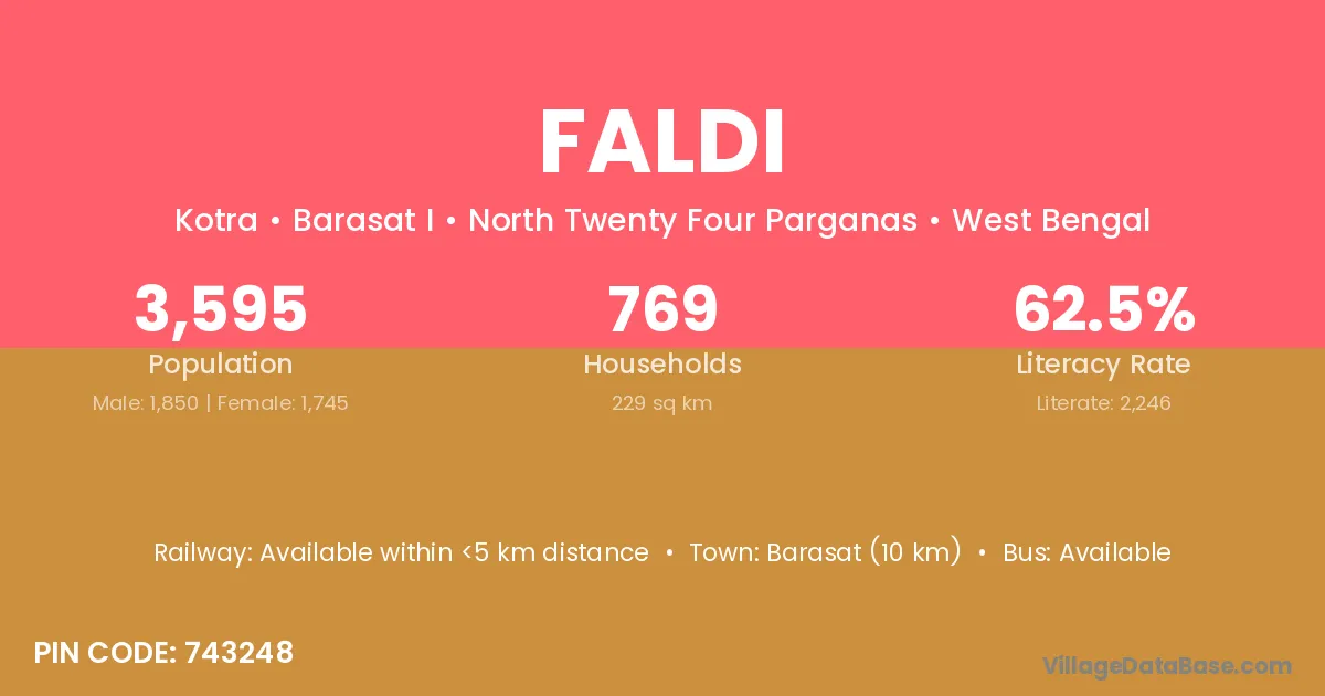 Barasat (10 km) is the nearest town to Faldi village for major economic activities and is located approximately 10 km away.