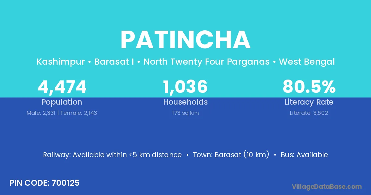 Patincha village is located in the Barasat I Subdivision of the North Twenty Four Parganas district in West Bengal.