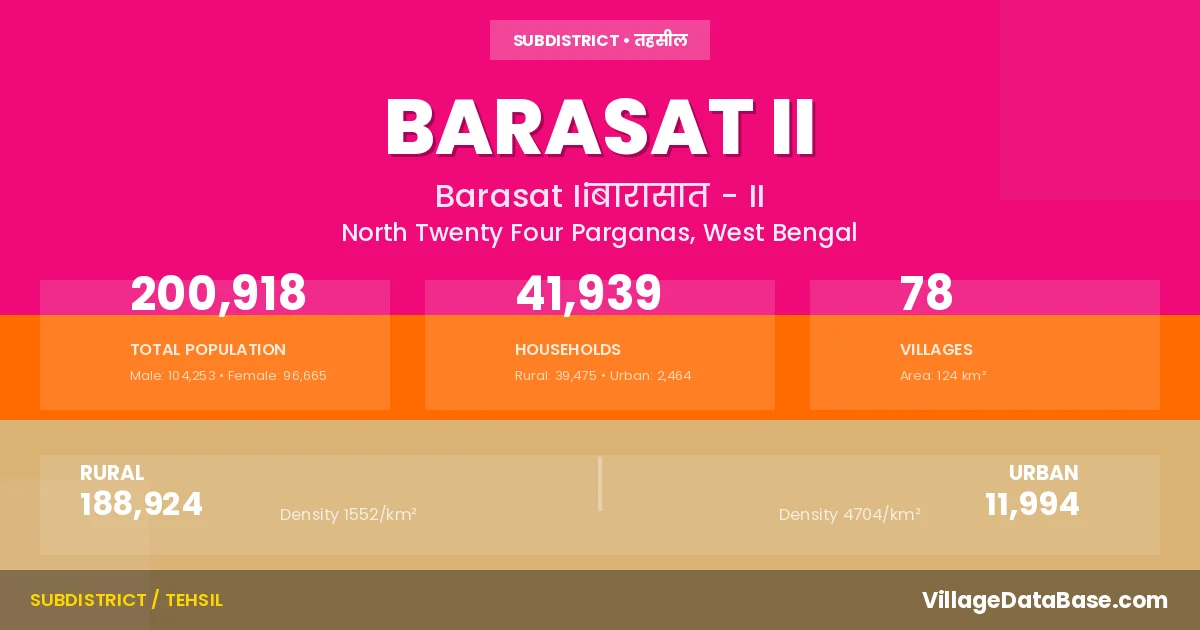 According to the 2011 census The total area of Barasat II Subdivision is 124 km², with a population of 200918 people. The population density is 1,617 inhabitants per square kilometre, and there are approximately 41939 houses in the sub district.