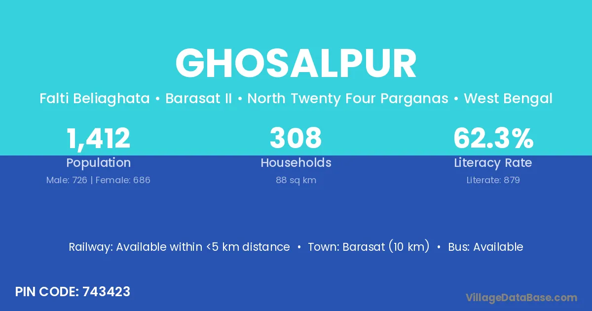 Barasat (10 km) is the nearest town to Ghosalpur village for major economic activities and is located approximately 10 km away.