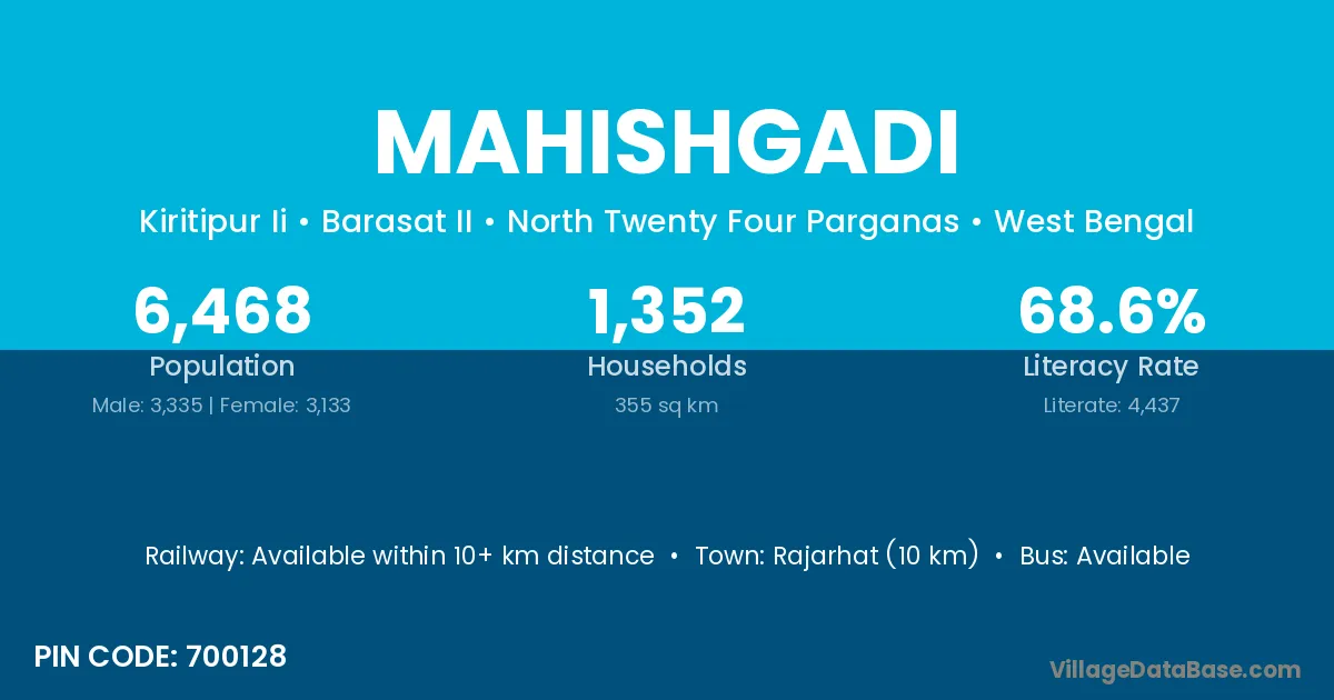 Rajarhat (10 km) is the nearest town to Mahishgadi village for major economic activities and is located approximately 10 km away.