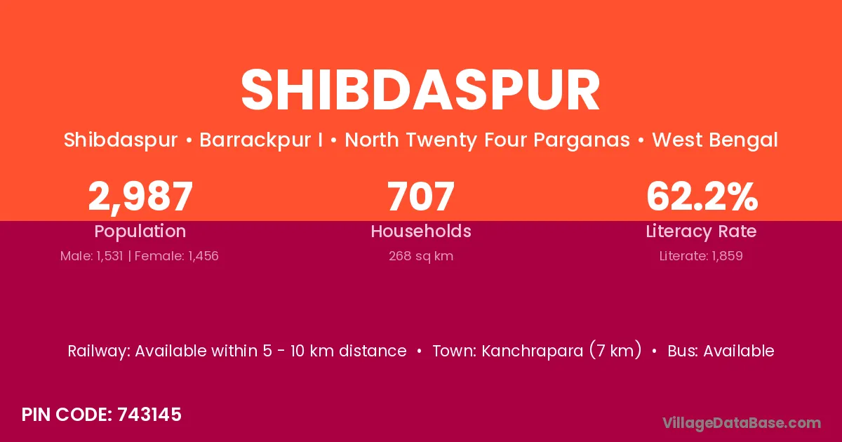 Kanchrapara (7 km) is the nearest town to Shibdaspur village for major economic activities and is located approximately 7 km away.