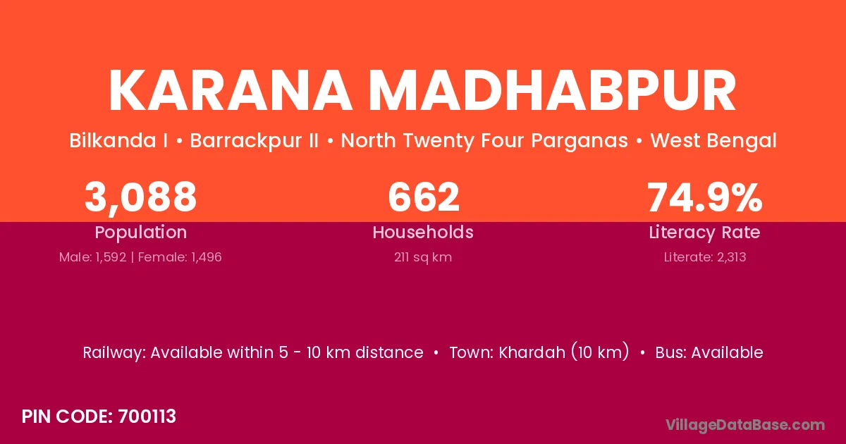 Khardah (10 km) is the nearest town to Karana Madhabpur village for major economic activities and is located approximately 10 km away.