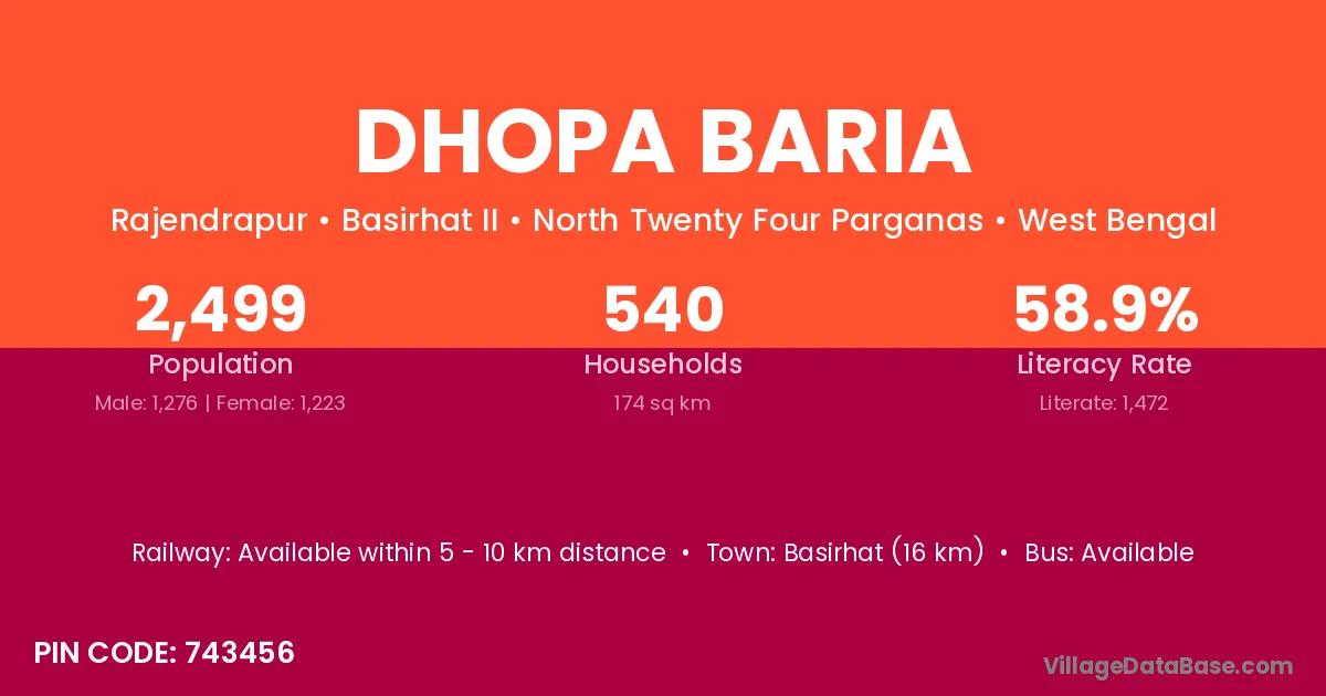 Basirhat (16 km) is the nearest town to Dhopa Baria village for major economic activities and is located approximately 16 km away.