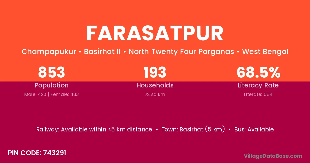 Basirhat (5 km) is the nearest town to Farasatpur village for major economic activities and is located approximately 5 km away.