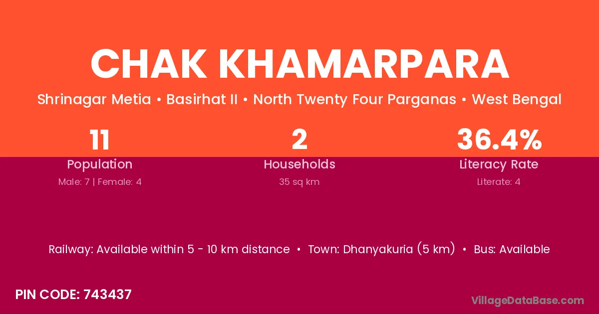 Chak Khamarpara village has a total population of 11 people, of which 7 are males and 4 are females.