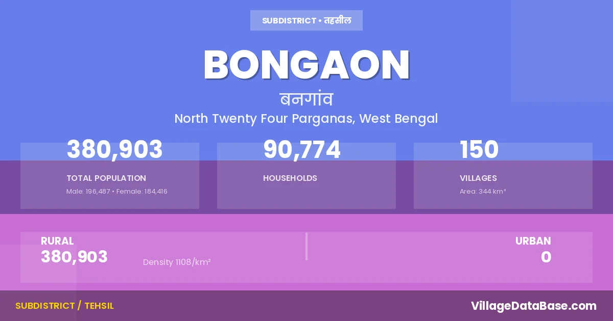 According to the 2011 census The total area of Bongaon Subdivision is 344 km², with a population of 380903 people. The population density is 1,108 inhabitants per square kilometre, and there are approximately 90774 houses in the sub district.
