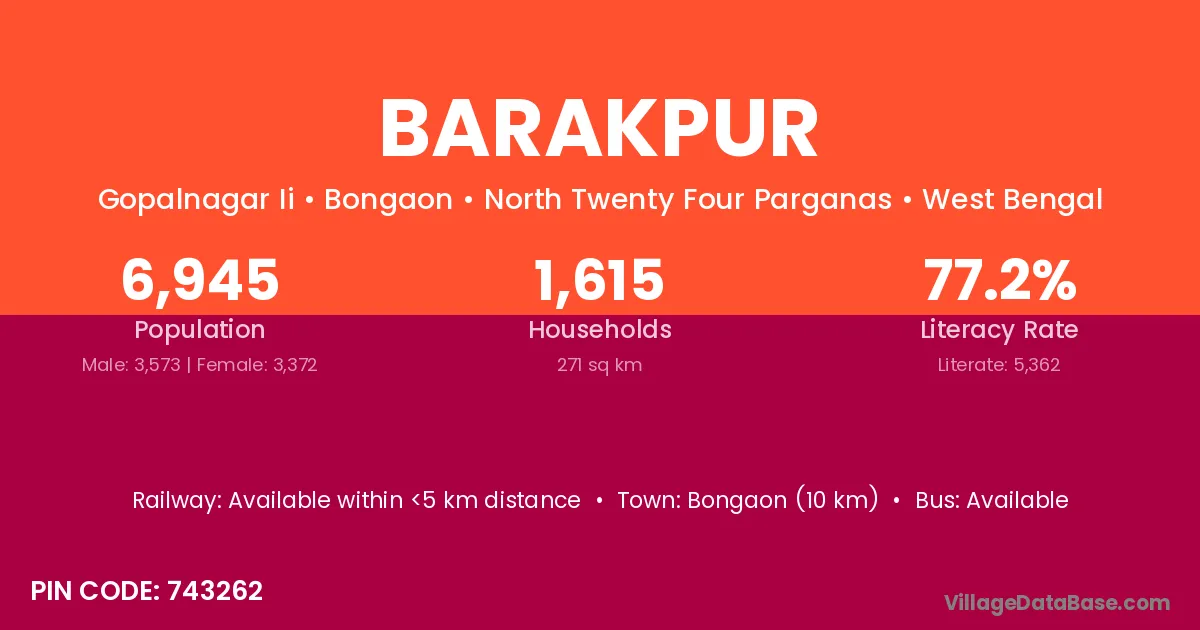 Bongaon (10 km) is the nearest town to Barakpur village for major economic activities and is located approximately 10 km away.