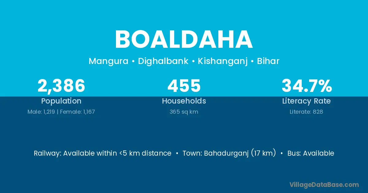 Bongaon (8 km) is the nearest town to Boaldaha village for major economic activities and is located approximately 8 km away.