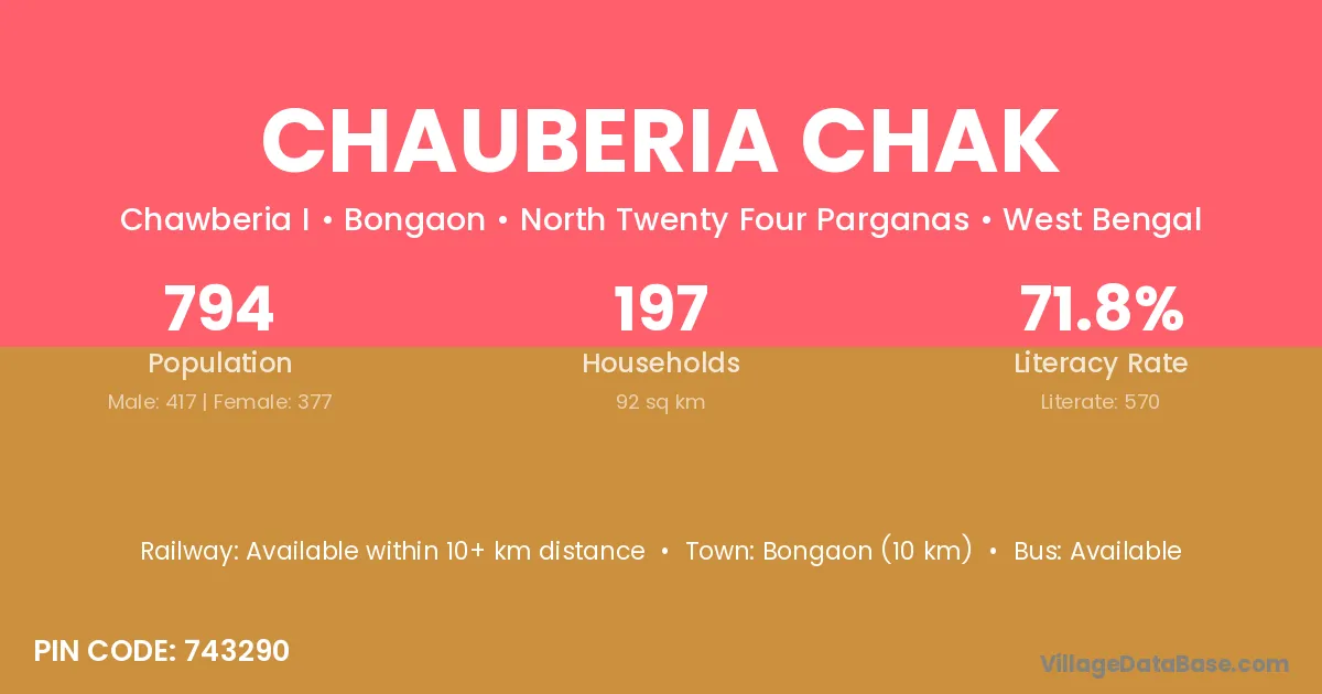 Bongaon (10 km) is the nearest town to Chauberia Chak village for major economic activities and is located approximately 10 km away.
