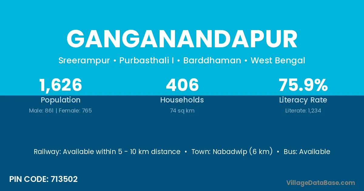 Bongaon (20 km) is the nearest town to Ganganandapur village for major economic activities and is located approximately 20 km away.