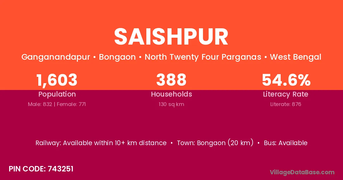 Bongaon (20 km) is the nearest town to Saishpur village for major economic activities and is located approximately 20 km away.
