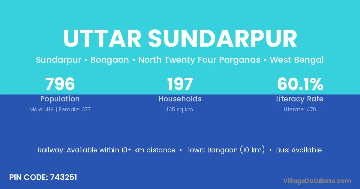 Bangaon (10 km) is the nearest town to Uttar Sundarpur village for major economic activities and is located approximately 10 km away.