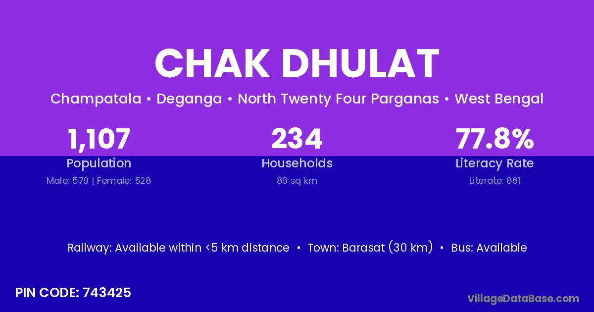 Barasat (30 km) is the nearest town to Chak Dhulat village for major economic activities and is located approximately 30 km away.