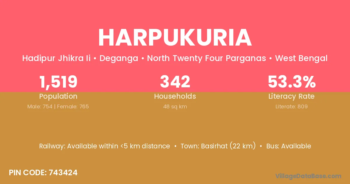 Basirhat (22 km) is the nearest town to Harpukuria village for major economic activities and is located approximately 22 km away.