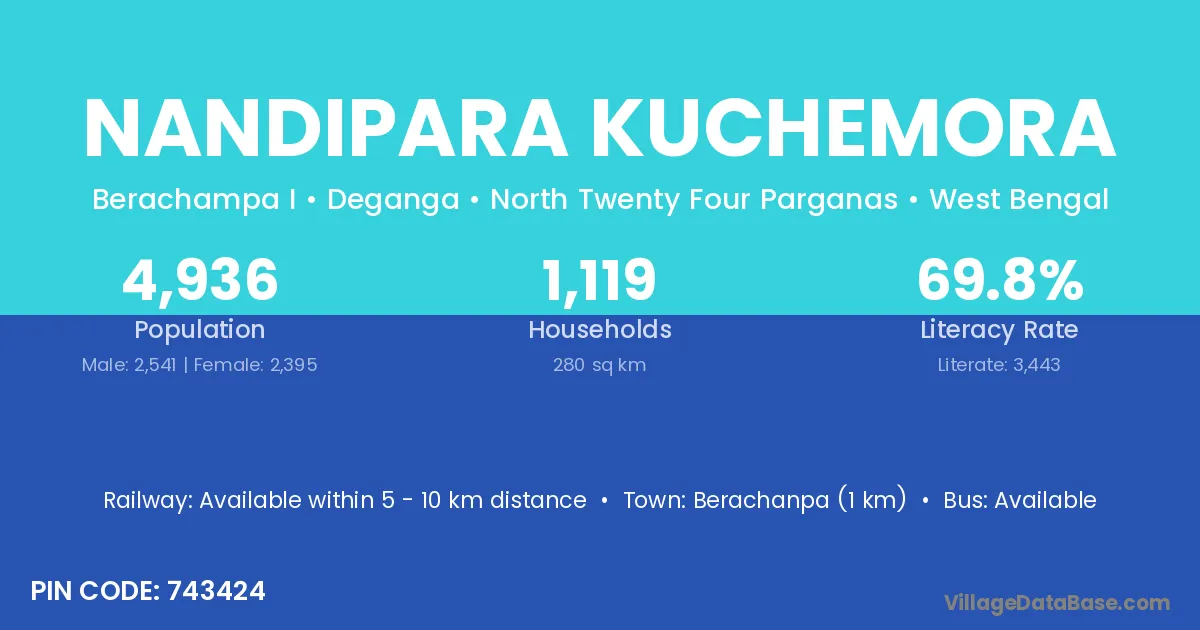 Berachanpa (1 km) is the nearest town to Nandipara Kuchemora village for major economic activities and is located approximately 1 km away.