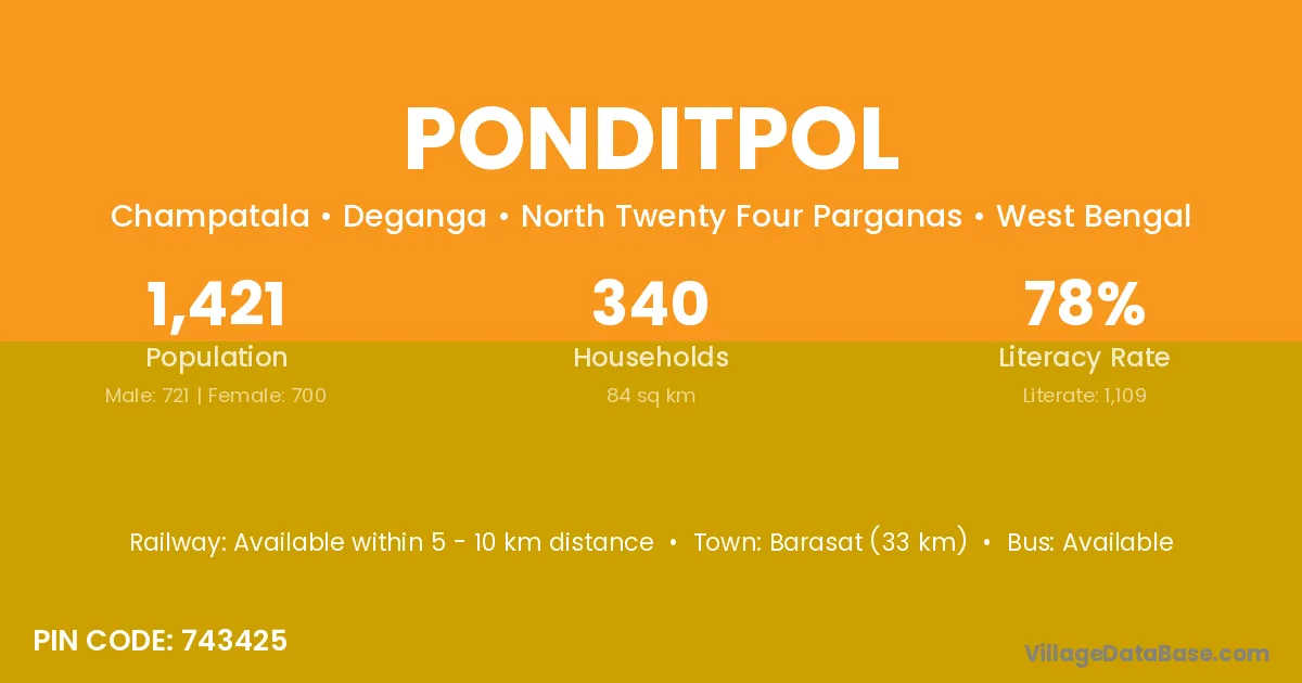 Barasat (33 km) is the nearest town to Ponditpol village for major economic activities and is located approximately 33 km away.