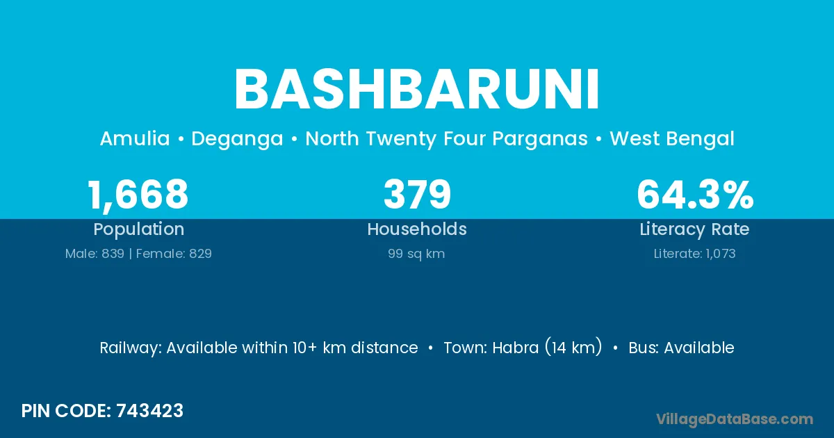 Habra (14 km) is the nearest town to Bashbaruni village for major economic activities and is located approximately 14 km away.