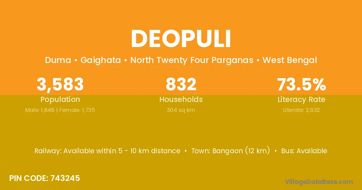 Bangaon (12 km) is the nearest town to Deopuli village for major economic activities and is located approximately 12 km away.