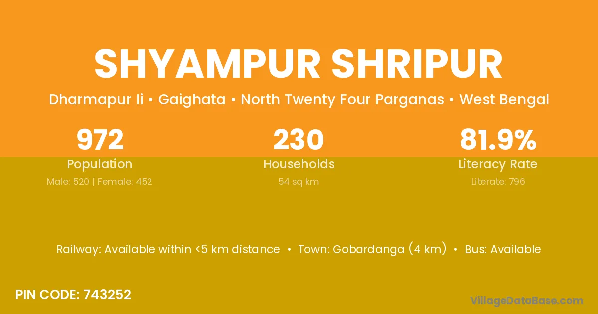 Gobardanga (4 km) is the nearest town to Shyampur Shripur village for major economic activities and is located approximately 4 km away.